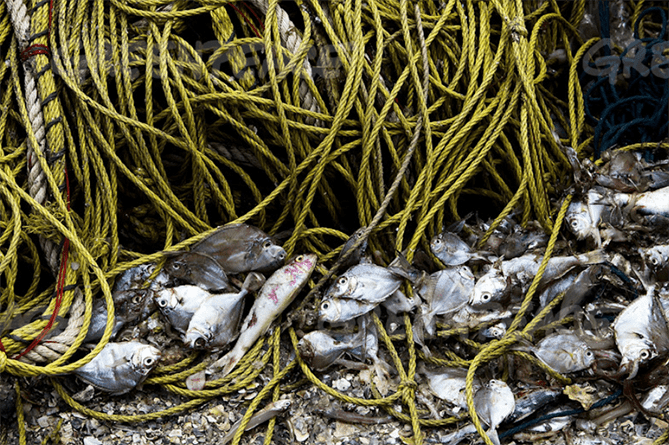Fish catch onboard a bottom trawler in the Gulf of Thailand. Bottom trawl fishing uses weighted nets that are dragged on the bottom of the seafloor and can destroy whole habitats. When used with very small net mesh sizes they also catch everything in their path including non targeted species and juvenile marine life. Greenpeace is documenting illegal and destructive fishing methodologies in the Gulf of Thailand as part of its Oceans Defender tour.