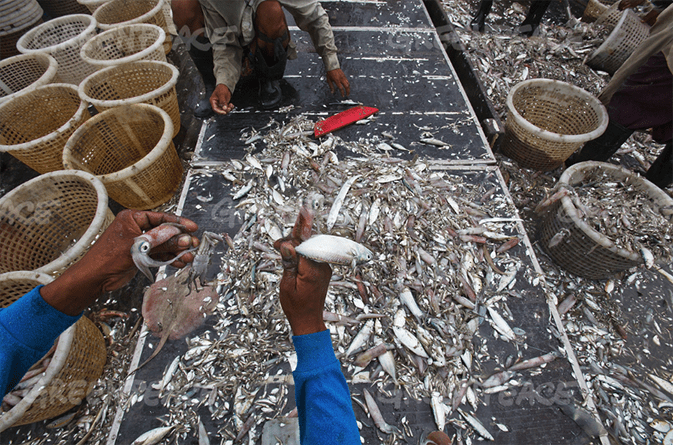 Workers sort fish catch onboard a bottom trawler in the Gulf of Thailand. Bottom trawl fishing uses weighted nets that are dragged on the bottom of the seafloor and can destroy whole habitats. When used with very small net mesh sizes they also catch everything in their path including non targeted species and juvenile marine life. Greenpeace is documenting illegal and destructive fishing methodologies in the Gulf of Thailand as part of its Oceans Defender tour.